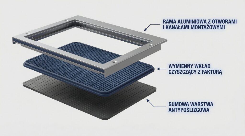 Sercem każdej wycieraczki systemowej są profile aluminiowe, które tworzą szkielet całej konstrukcji. Aluminium wybrano nieprzypadkowo – jest lekkie, odporne na korozję i utrzymuje stabilny kształt nawet przy intensywnym użytkowaniu. Wewnątrz profili montuje się wymienne wkłady czyszczące. To właśnie one wykonują ciężką pracę – usuwają wodę, piasek, błoto i drobne zanieczyszczenia z podeszew butów. Rodzaj wkładu dobiera się do specyfiki miejsca i rodzaju zanieczyszczeń.